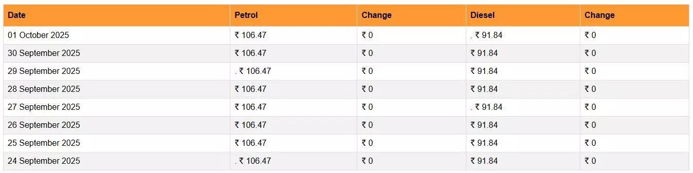 डिजिटल डेस्क, नई दिल्ली। अंतर्राष्ट्रीय बाजार में कच्चे तेल की कीमतों में गिरावट देखने को मिली है। इस बीच राष्ट्रीय तेल कंपनियों (इंडियन ऑयल, भारत पेट्रोलियम और हिंदुस्तान पेट्रोलियम) ने पेट्रोल-डीजल (Petrol-Diesel) के ताजा दाम जारी कर दिए हैं। जिसके अनुसार, आज (01 अक्टूबर 2025, बुधवार) ईंधन के रेट में किसी प्रकार का कोई संसोधन नहीं किया गया है। बता दें कि, देश की तेल कंपनियां हर दिन सुबह 6 विभिन्न शहरों की पेट्रोल और डीजल की कीमतों की जानकारी अपडेट करती हैं। ऐसे में अपनी गाड़ी का टैंक फुल कराने से पहले चेक करें ईंधन के अपडेट रेट...