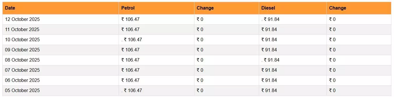 डिजिटल डेस्क, नई दिल्ली। कच्चे तेल की कीमतों में बीते दिनों लगातार उतार- चढ़ाव देखने को मिला। लेकिन, राष्ट्रीय तेल कंपनियों (इंडियन ऑयल, भारत पेट्रोलियम और हिंदुस्तान पेट्रोलियम) की ओर से पेट्रोल-डीजल (Petrol-Diesel) के रेट में किसी तरह का संशोधन नहीं किया गया है। बता दें कि, बीते 3 साल से भी अधिक समय से ईंधन के रेट में कोई फेरबदल नहीं हुआ है। आज (12 अक्टूबर 2025, रविवार) सुबह भी के ताजा रेट अपडेट कर दिए गए, जिसमें कोई बदलाव नहीं किया गया।
