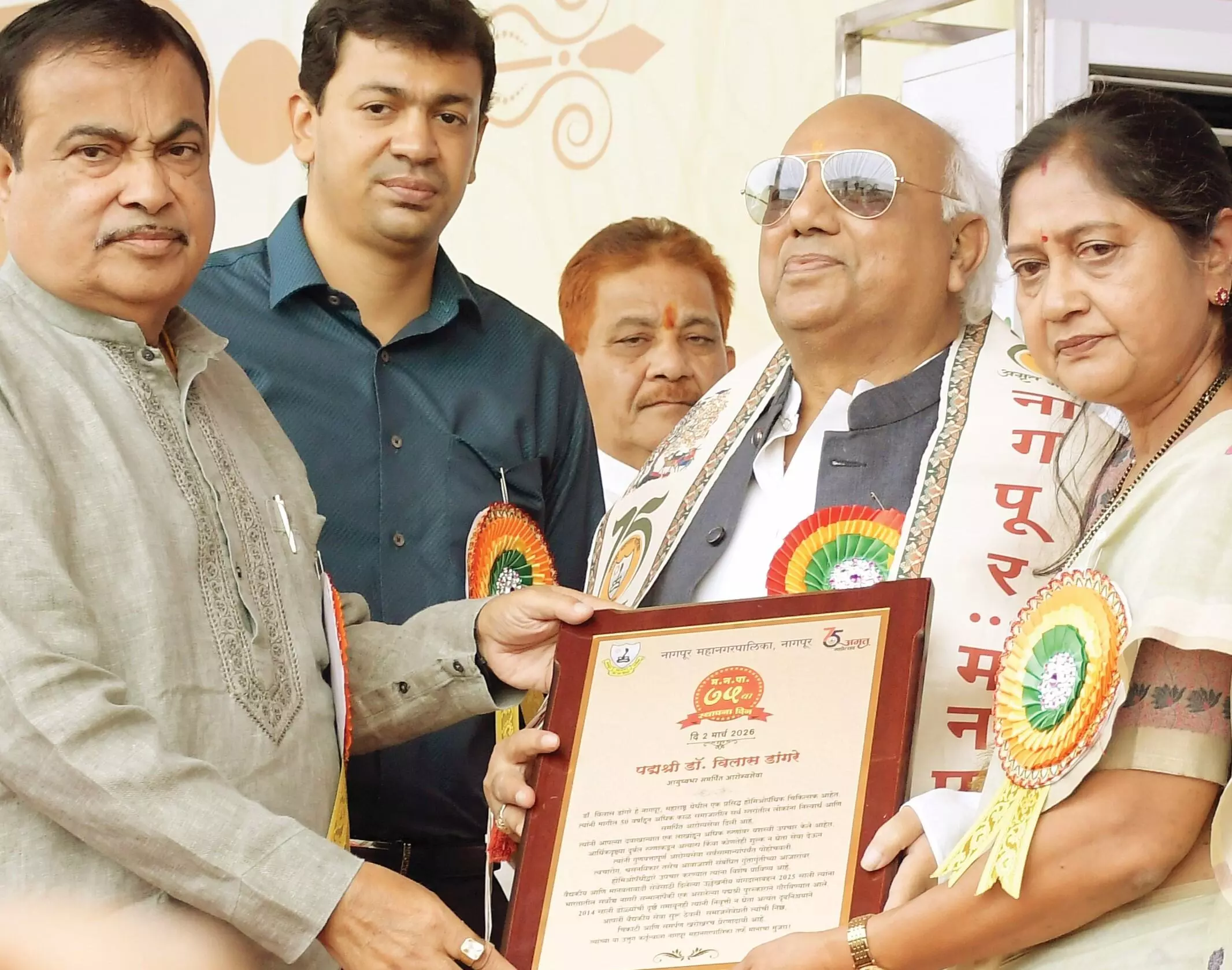 इनका हुआ सत्कार : मनपा के 75वें अमृत महोत्सव में पद्मश्री जनार्दनपंत बोथे, सत्यनारायण नुवाल और डॉ. विलास डांगरे का सत्कार किया जाना था, लेकिन इसमें से डॉ. विलास डांगरे ही समारोह में पहुंचे। इस दौरान गड़करी के हाथों डॉ. विलास डांगरे का सत्कार किया गया। कार्यक्रम में पूर्व महापौर कुंदा विजयकर, दयाशंकर तिवारी, वसुंधरा मासुरकर, पांडुरंग हिवरकर, अर्चना डेहनकर, प्रा. अनिल सोले, नंदा जिचकार, राजेश तांबे, किशोर डोरले समेत अन्य का भी सत्कार किया गया। इस दौरान दिवंगत पूर्व महापौर और उपमहापौर के परिजनों और परिवार के अन्य सदस्य उपस्थित थे।