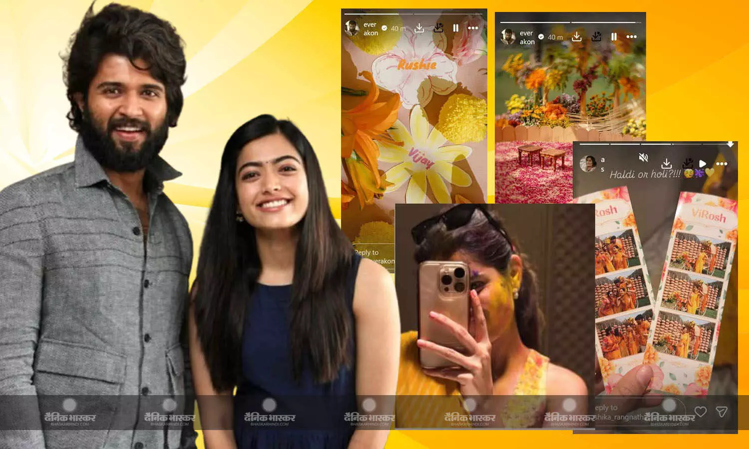 दोनों सितारों के फैंस दूल्हा-दुल्हन के रूप में विरोश की झलक देखने को बेताब हैं। बुधवार को विजय ने अपनी इंस्टा स्टोरी से हल्दी की फोटोज शेयर की हैं। पूरे वेन्यू को पीले रंग के फूलों से सजाया गया है। फूलों पर दोनों का नाम लिखा है।