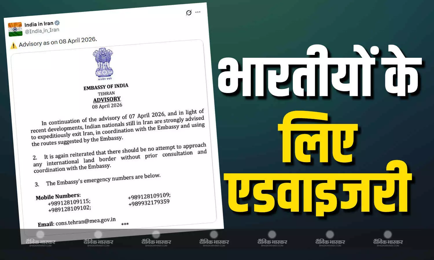 एंबेसी ने इमरजेंसी और हेल्पलाइन नंबर्स जारी किए हैं। दूतावास ने एडवाइजरी में कहा है कि 7 अप्रैल 2026 की एडवाइजरी के संदर्भ में और हाल की घटनाओं पर नजर रखते हुए, ईरान में रह रहे सभी भारतीय नागरिकों को दूतावास के मार्गदर्शन और सुझाए गए मार्गों का पालन करते हुए ईरान को जल्द से जल्द छोड़ने की सलाह दी जाती है। साथ ही एडवाइजरी में ये भी साफ तौर पर कहा है कि किसी भी इंटरनेशनल बॉर्डर के पास बिना एंबेसी से पूर्व परामर्श किए जाने की कोशिश ना करें।