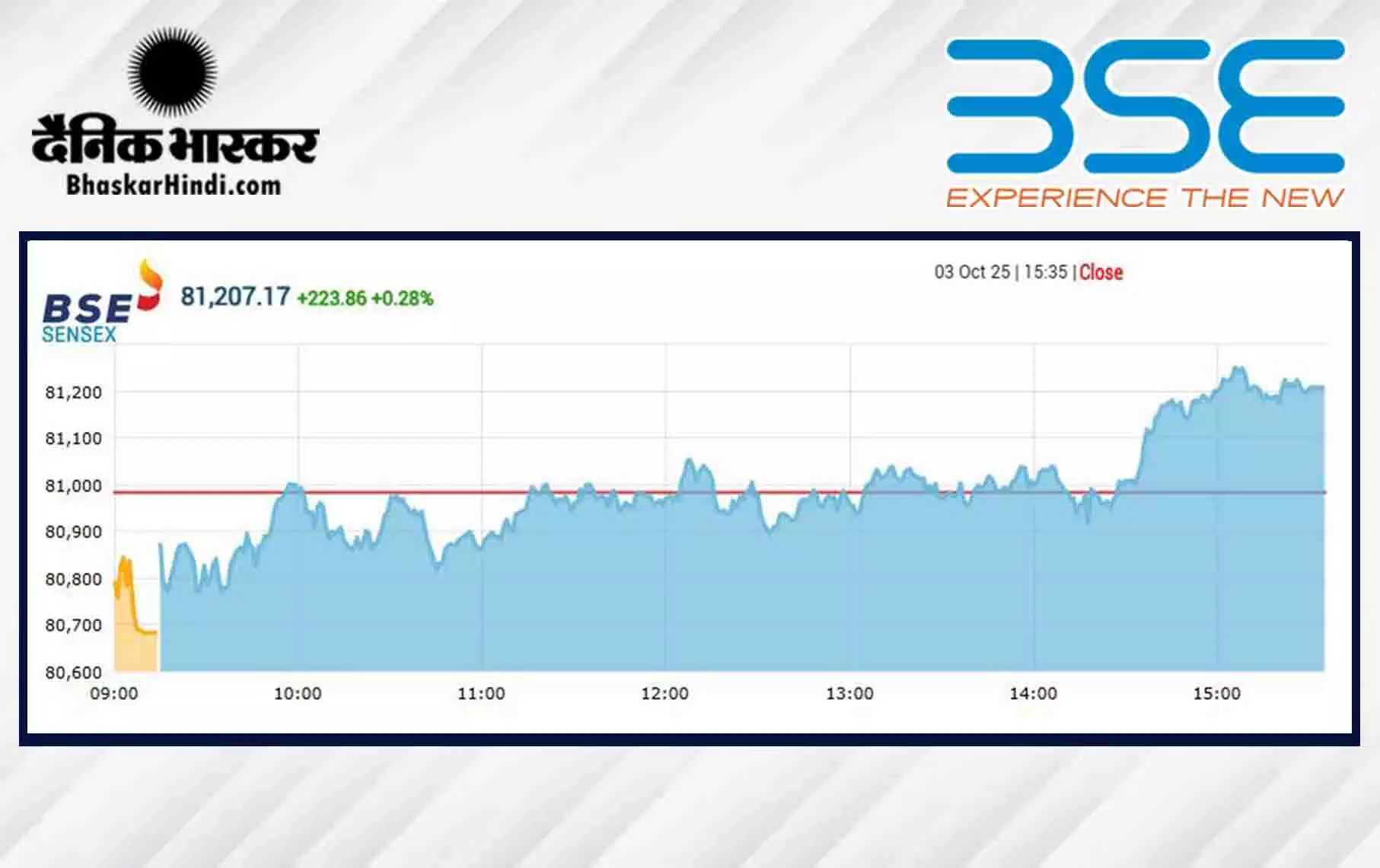 डिजिटल डेस्क, मुंबई। देश का शेयर बाजार (Share Market) आज (03 अक्टूबर 2025, शुक्रवार) दिनभर के उतार- चढ़ाव के बाद बढ़त के साथ बंद हुआ। इस दौरान प्रमुख भारतीय इक्विटी सूचकांक बीएसई सेंसेक्स (Sensex) और एनएसई निफ्टी (Nifty) दोनों ही हर निशान पर रहे। कारोबारी सप्ताह के पांचवें और आखिरी दिन बंबई स्टॉक एक्सचेंज (BSE) के 30 शेयरों पर आधारित संवेदी सेंसेक्स 223.86 अंक यानि कि 0.28 प्रतिशत की बढ़त के साथ 81,207.17 के स्तर पर बंद हुआ।