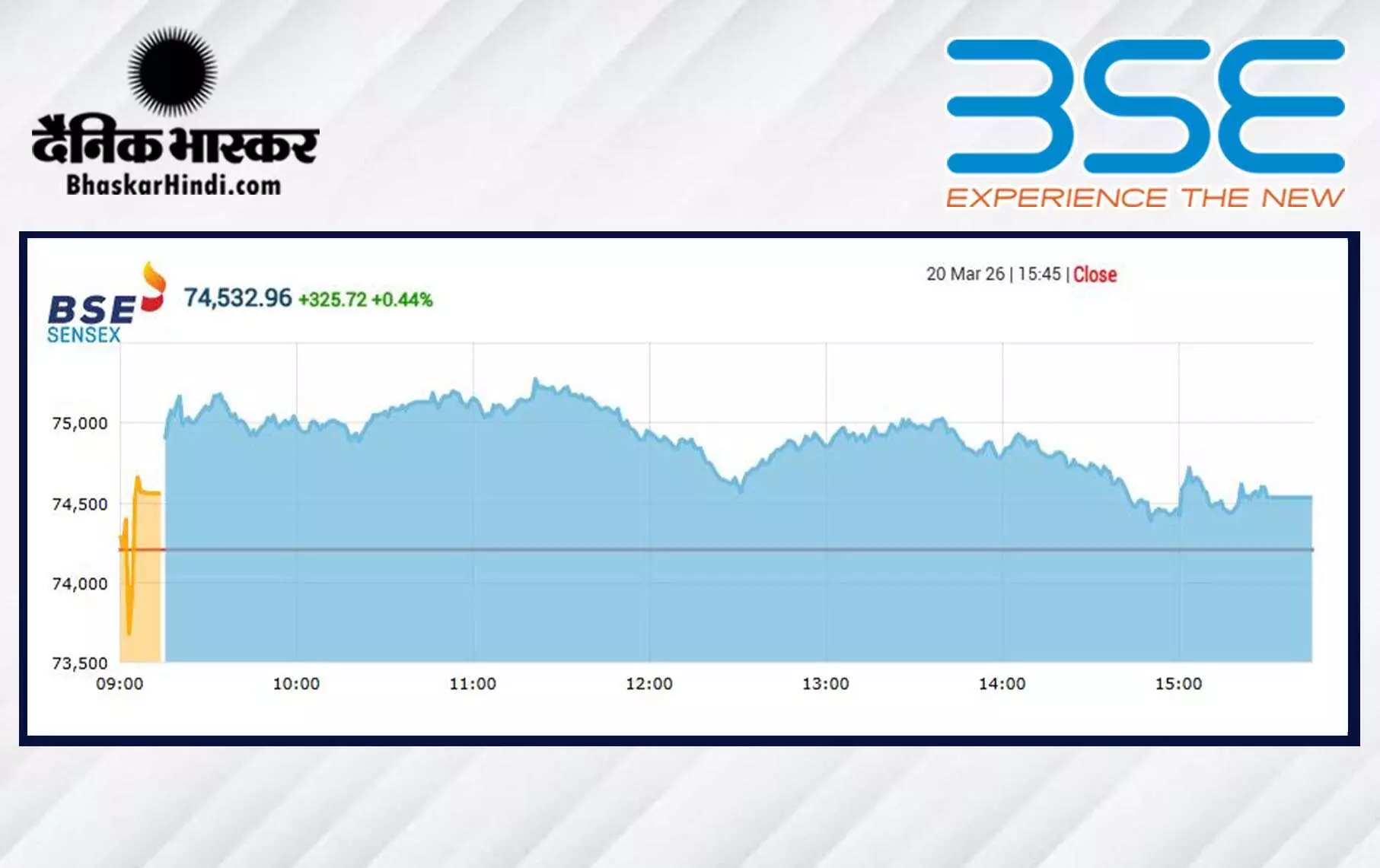 डिजिटल डेस्क, मुंबई। देश का शेयर बाजार (Share Market) कारोबारी सप्ताह के पांचवें और आखिरी दिन (20 मार्च 2026, शुक्रवार) बढ़त के साथ बंद हुआ। इस दौरान प्रमुख भारतीय इक्विटी सूचकांक बीएसई सेंसेक्स (Sensex) और एनएसई निफ्टी (Nifty) दोनों ही हरे निशान पर रहे। बंबई स्टॉक एक्सचेंज (BSE) के 30 शेयरों पर आधारित संवेदी सेंसेक्स 325.72 अंक यानि कि 0.44 प्रतिशत बढ़कर 74,532.96 के स्तर पर बंद हुआ।