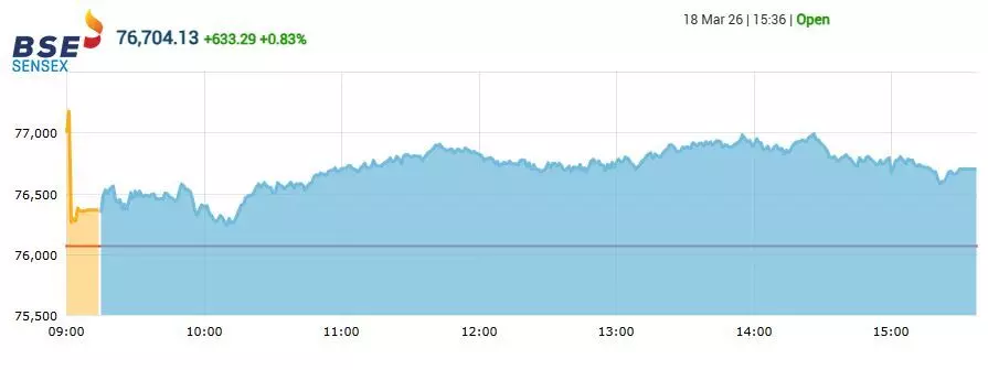 डिजिटल डेस्क, मुंबई। देश का शेयर बाजार (Share Market) कारोबारी सप्ताह के तीसरे दिन (18 मार्च 2026, बुधवार) बढ़त के साथ बंद हुआ। इस दौरान प्रमुख भारतीय इक्विटी सूचकांक बीएसई सेंसेक्स (Sensex) और एनएसई निफ्टी (Nifty) दोनों ही हरे निशान पर रहे। आज बंबई स्टॉक एक्सचेंज (BSE) के 30 शेयरों पर आधारित संवेदी सेंसेक्स 633.29 अंक यानि कि 0.83 प्रतिशत बढ़कर 76,704.13 के स्तर पर बंद हुआ।