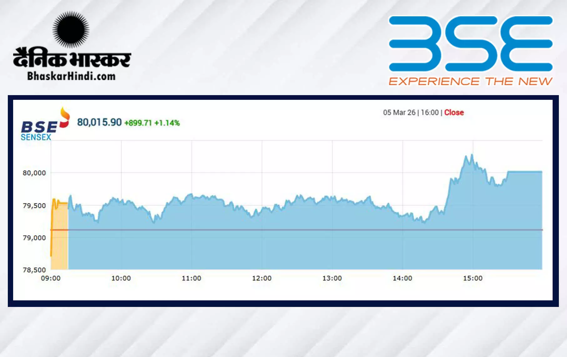 डिजिटल डेस्क, मुंबई। भारतीय शेयर बाजार (Share Market) कारोबारी सप्ताह के चौथे दिन (05 मार्च 2026, गुरुवार) बढ़त के साथ बंद हुआ। इस दौरान प्रमुख भारतीय इक्विटी सूचकांक बीएसई सेंसेक्स (Sensex) और एनएसई निफ्टी (Nifty) दोनों ही हरे निशान पर रहे। बंबई स्टॉक एक्सचेंज (BSE) के 30 शेयरों पर आधारित संवेदी सेंसेक्स 899.71 अंक यानि कि 1.14 प्रतिशत बढ़कर 80,015.90 के स्तर पर बंद हुआ।