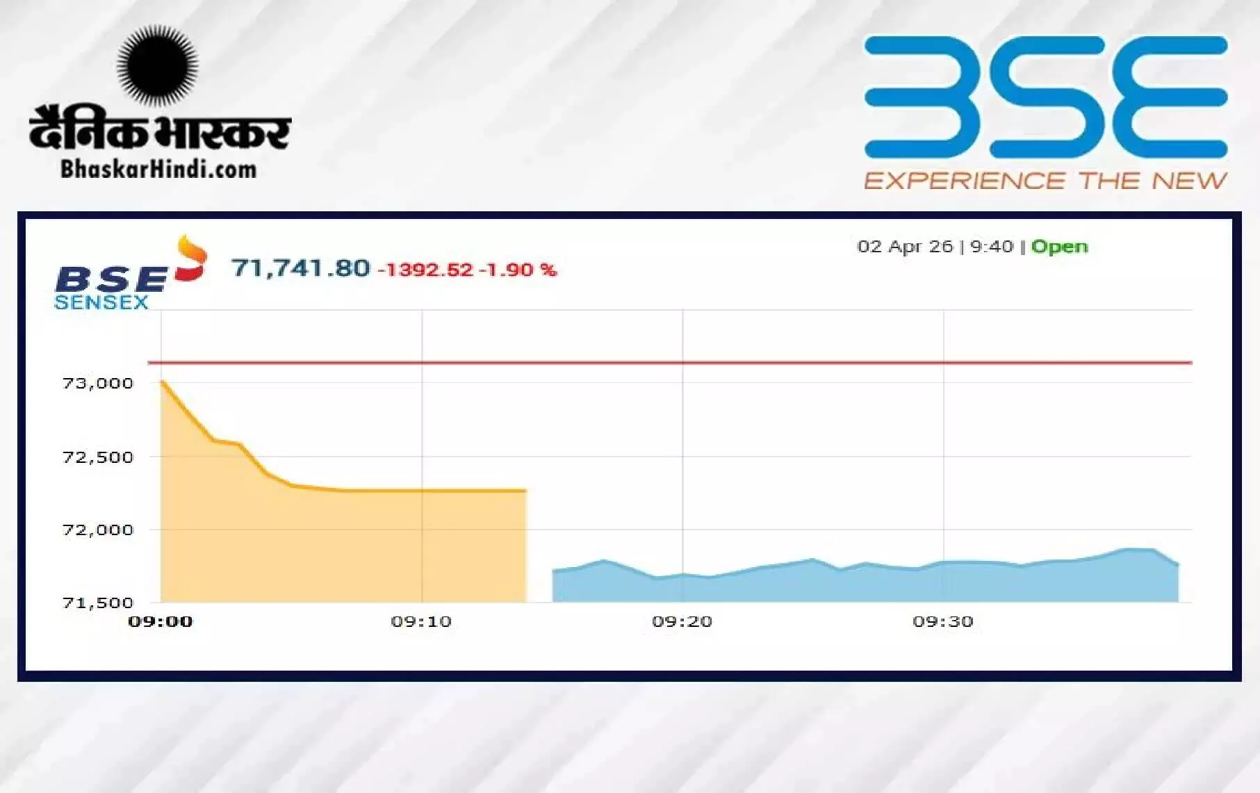 डिजिटल डेस्क, मुंबई। भारतीय शेयर बाजार (Share Market) कारोबारी सप्ताह के चौथे दिन (02 अप्रैल 2026, गुरुवार) गिरावट के साथ खुला। इस दौरान प्रमुख भारतीय इक्विटी सूचकांक बीएसई सेंसेक्स (Sensex) और एनएसई निफ्टी (Nifty) दोनों ही लाल निशान पर रहे। आज बंबई स्टॉक एक्सचेंज (BSE) के 30 शेयरों पर आधारित संवेदी सेंसेक्स 1,314.02 अंक यानि कि 1.80 प्रतिशत गिरकर 71,820.30 के स्तर पर खुला।