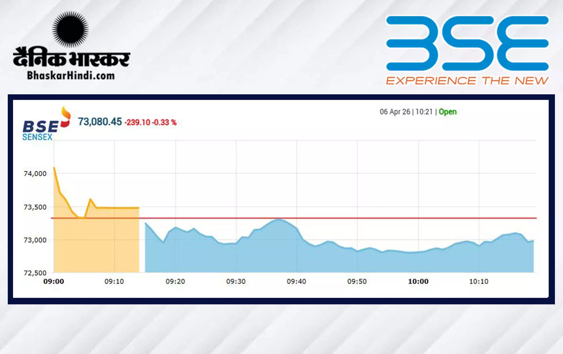 डिजिटल डेस्क, मुंबई। दुनिया भर से मिले-जुले संकेतों के बावजूद भारतीय शेयर बाजार (Share Market) कारोबारी सप्ताह के पहले दिन (06 अप्रैल 2026, सोमवार) गिरावट के साथ खुला। इस दौरान प्रमुख भारतीय इक्विटी सूचकांक बीएसई सेंसेक्स (Sensex) और एनएसई निफ्टी (Nifty) दोनों ही लाल निशान पर रहे। बंबई स्टॉक एक्सचेंज (BSE) के 30 शेयरों पर आधारित संवेदी सेंसेक्स 163.24 अंक यानि कि 0.22 प्रतिशत गिरकर 73,156.31 के स्तर पर खुला।