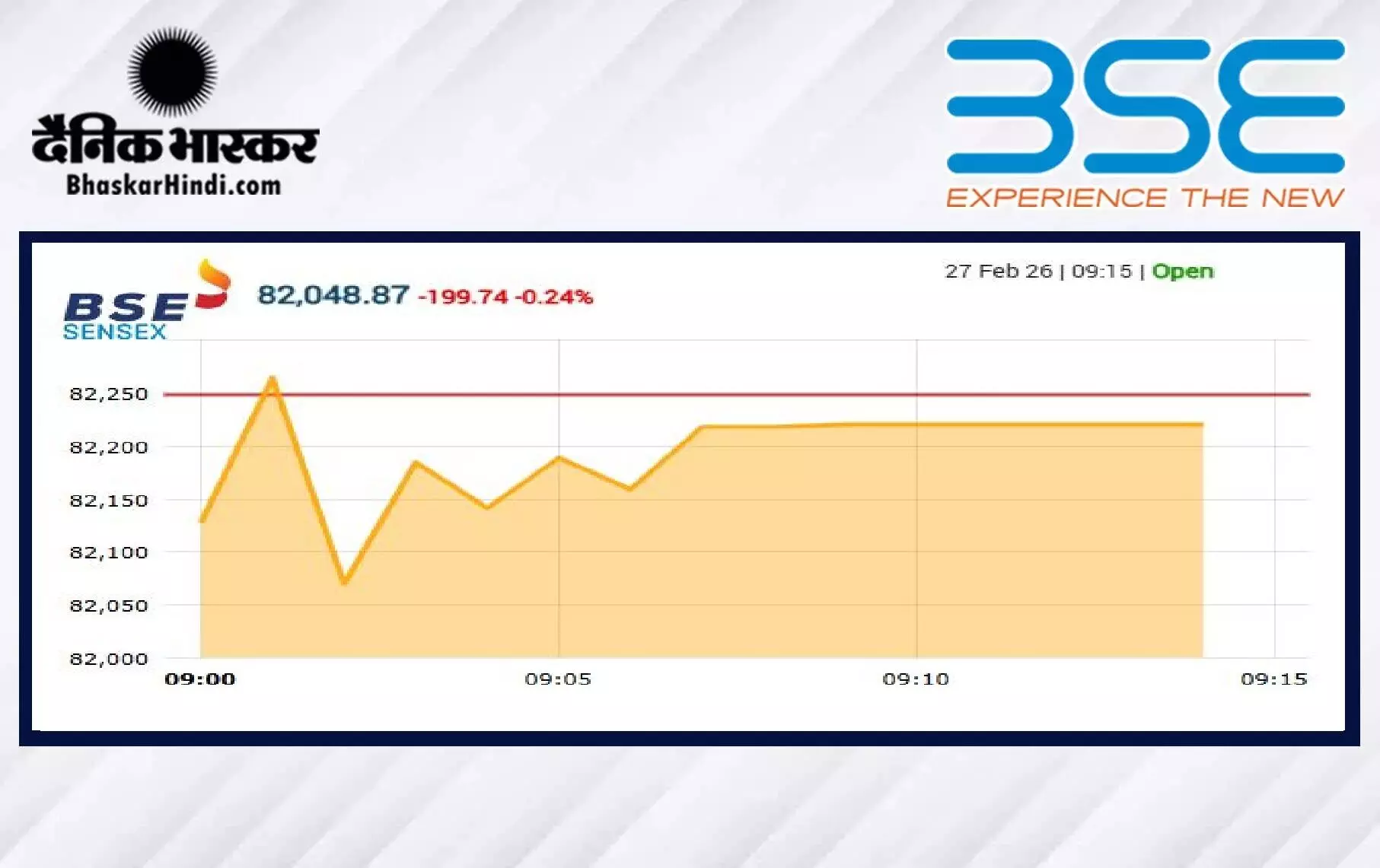 डिजिटल डेस्क, मुंबई। मिले-जुले ग्लोबल संकेतों के बीच देश का शेयर बाजार (Share Market) कारोबारी सप्ताह के पांचवें और आखिरी दिन (27 फरवरी 2026, शुक्रवार) गिरावट के साथ खुला। इस दौरान प्रमुख भारतीय इक्विटी सूचकांक बीएसई सेंसेक्स (Sensex) और एनएसई निफ्टी (Nifty) दोनों ही लाल निशान पर रहे। बंबई स्टॉक एक्सचेंज (BSE) के 30 शेयरों पर आधारित संवेदी सेंसेक्स 199.74 अंक यानि कि 0.24 प्रतिशत गिरकर 82,048.87 के स्तर पर खुला।