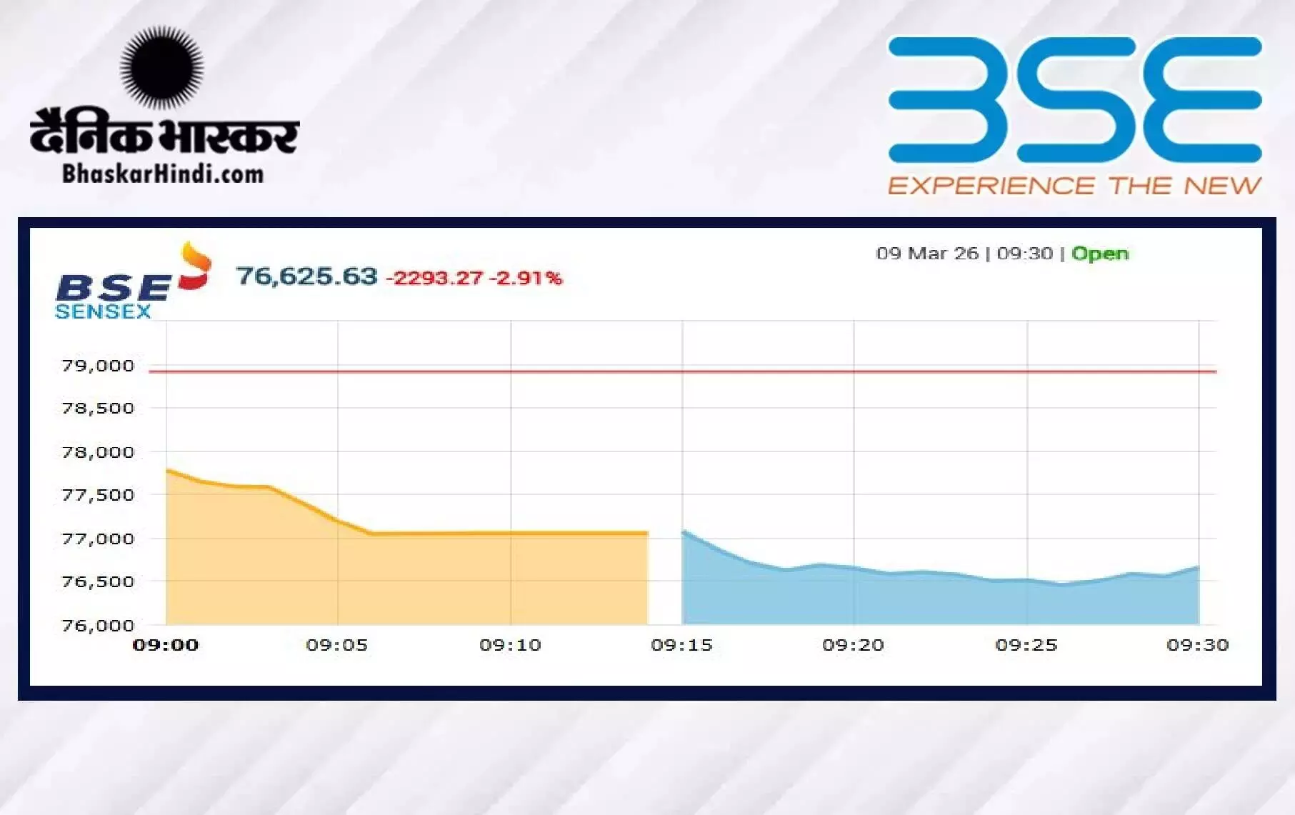 डिजिटल डेस्क, मुंबई। ईरान-इजरायल जंग से मिडिल ईस्ट में बने तनाव का बड़ा असर शेयर बाजार (Share Market) में देखने को मिल रहा है। कारोबारी सप्ताह के पहले दिन (09 मार्च 2026, सोमवार) भारतीय शेयर की शुरुआत भारी गिरावट के साथ हुई। इस दौरान प्रमुख भारतीय इक्विटी सूचकांक बीएसई सेंसेक्स (Sensex) और एनएसई निफ्टी (Nifty) दोनों ही धराशाई हो गए। बंबई स्टॉक एक्सचेंज (BSE) के 30 शेयरों पर आधारित संवेदी सेंसेक्स 1,994.66 अंक यानि कि 2.53 प्रतिशत नीचे 76,924.24 के स्तर पर खुला।