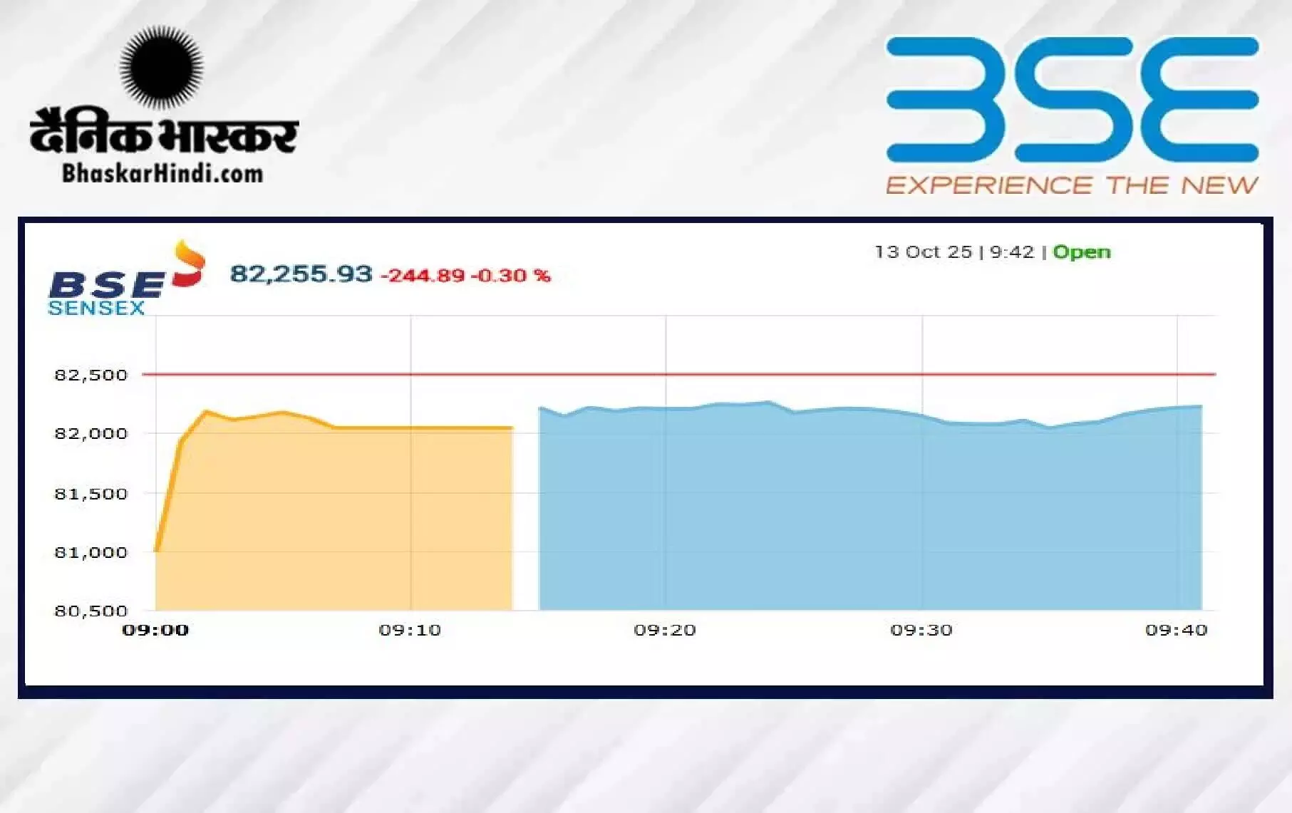 डिजिटल डेस्क, मुंबई। कमजोर वैश्विक बाजारों के चलते देश का शेयर बाजार (Share Market) कारोबारी सप्ताह के पहले दिन (13 अक्टूबर 2025, सोमवार) गिरावट के साथ खुला। इस दौरान प्रमुख भारतीय इक्विटी सूचकांक बीएसई सेंसेक्स (Sensex) और एनएसई निफ्टी (Nifty) दोनों ही लाल निशान पर रहे। बंबई स्टॉक एक्सचेंज (BSE) के 30 शेयरों पर आधारित संवेदी सेंसेक्स 289.74 अंक यानि कि 0.35 प्रतिशत की गिरावट के साथ 82,211.08 के स्तर पर खुला।