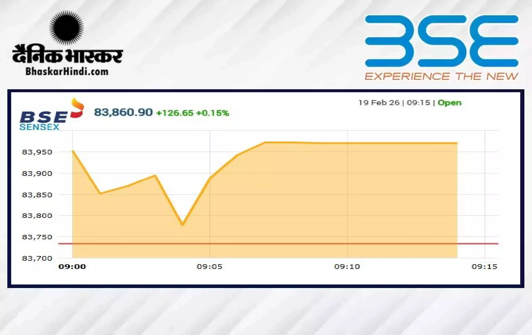 डिजिटल डेस्क, मुंबई। सकारात्मक पॉजिटिव ग्लोबल संकेतों के चलते देश का शेयर बाजार (Share Market) कारोबारी सप्ताह के चौथे दिन (19 फरवरी 2026, गुरुवार) बढ़त के साथ खुला। इस दौरान प्रमुख भारतीय इक्विटी सूचकांक बीएसई सेंसेक्स (Sensex) और एनएसई निफ्टी (Nifty) दोनों ही हरे निशान पर रहे। बंबई स्टॉक एक्सचेंज (BSE) के 30 शेयरों पर आधारित संवेदी सेंसेक्स 126.65 अंक यानि कि 0.15 प्रतिशत बढ़कर 83,860.90 के स्तर पर खुला।