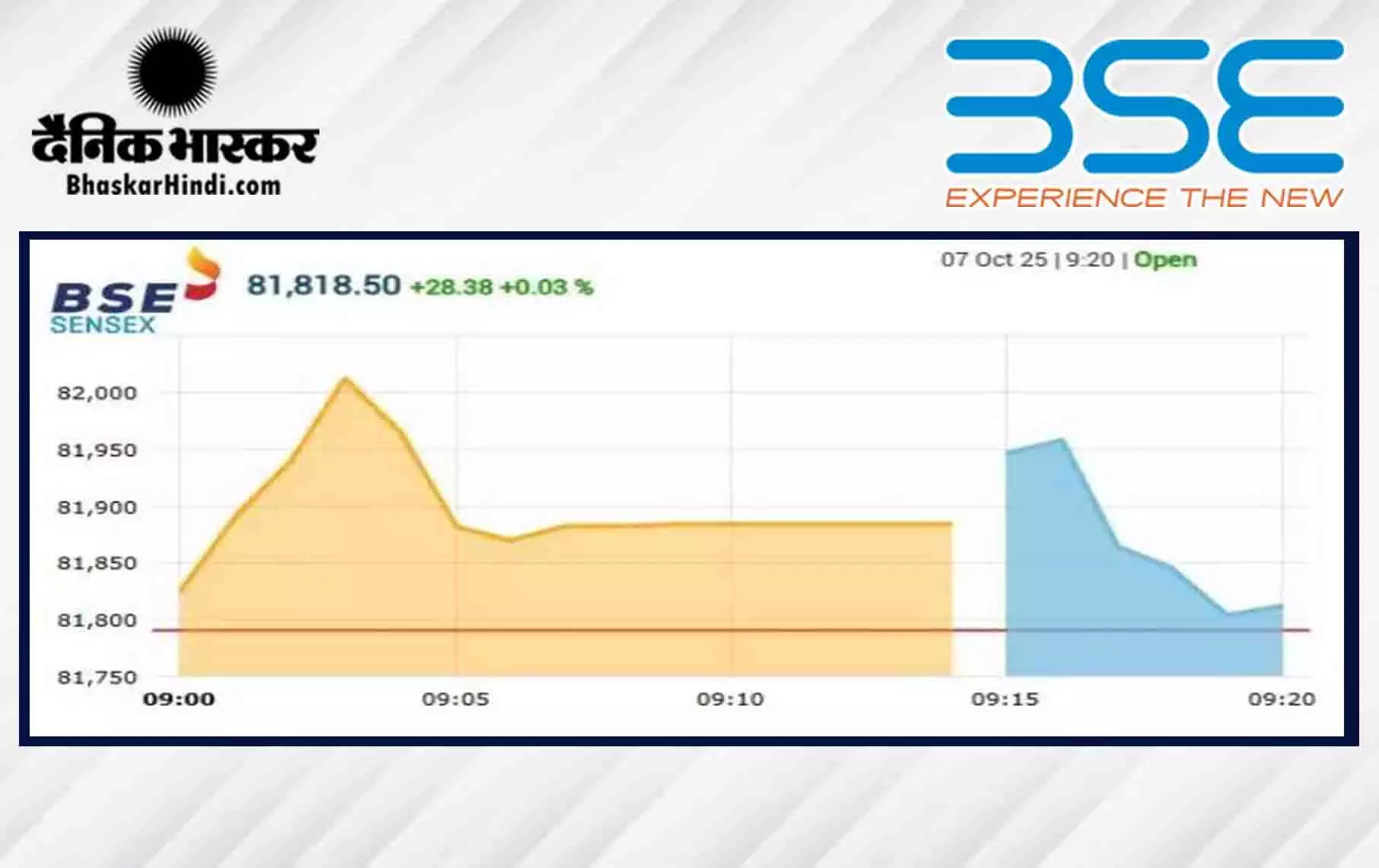 डिजिटल डेस्क, मुंबई। मिश्रित वैश्विक संकेतों के बावजूद देश का शेयर बाजार (Share Market) कारोबारी सप्ताह के दूसरे दिन (07 अक्टूबर 2025, मंगलवार) बढ़त के साथ खुला। इस दौरान प्रमुख भारतीय इक्विटी सूचकांक बीएसई सेंसेक्स (Sensex) और एनएसई निफ्टी (Nifty) दोनों ही हरे निशान पर रहे। बंबई स्टॉक एक्सचेंज (BSE) के 30 शेयरों पर आधारित संवेदी सेंसेक्स 161.88 अंक यानि कि 0.20 प्रतिशत बढ़कर 81,952.00 के स्तर पर खुला।