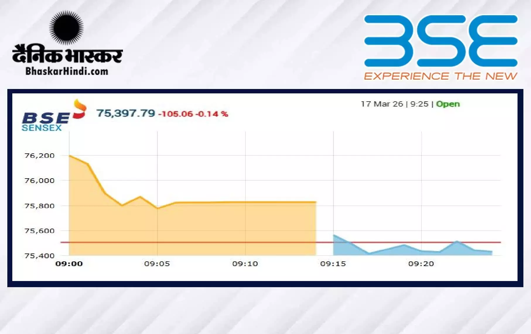 डिजिटल डेस्क, मुंबई। देश का शेयर बाजार (Share Market) कारोबारी सप्ताह के दूसरे दिन (17 मार्च 2026, मंगलवार) बढ़त के साथ खुला। इस दौरान प्रमुख भारतीय इक्विटी सूचकांक बीएसई सेंसेक्स (Sensex) और एनएसई निफ्टी (Nifty) दोनों ही हरे निशान पर रहे। आज बंबई स्टॉक एक्सचेंज (BSE) के 30 शेयरों पर आधारित संवेदी सेंसेक्स 323.83 अंक यानि कि 0.43 फीसदी उछलकर 75,826.68 के स्तर पर खुला।