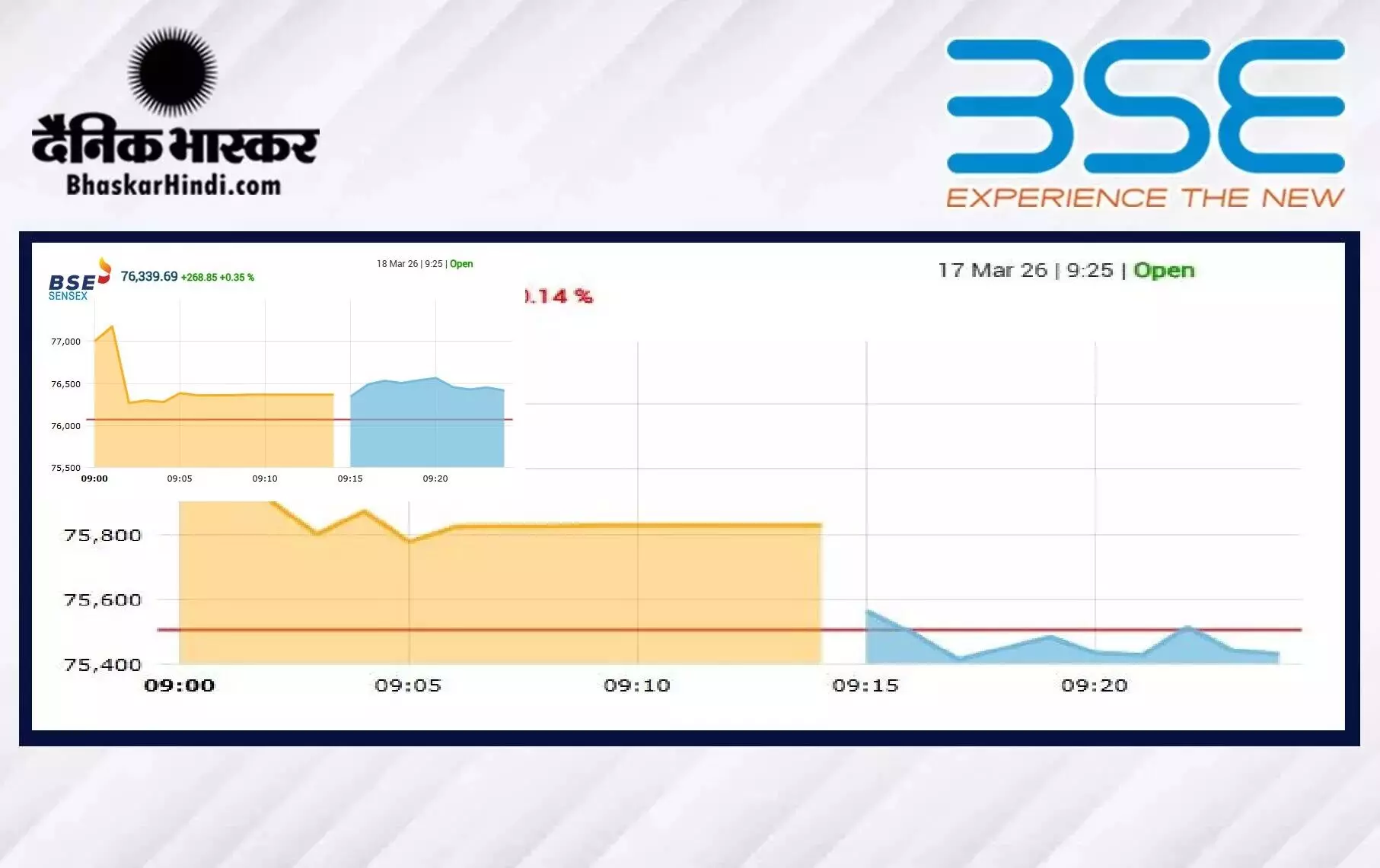 आपको बता दें कि, बीते कारोबारी दिन (17 मार्च 2026, मंगलवार) शेयर बाजार की शुरुआत बढ़त के साथ हुई थी। इस दौरान सेंसेक्स 323.83 अंक यानि कि 0.43 फीसदी उछलकर 75,826.68 के स्तर पर खुला था। वहीं निफ्टी 85 अंकों की तेजी के साथ 23,493.20 के स्तर पर खुला था।