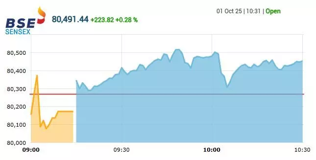 आपको बता दें कि, बीते कारोबारी दिन (30 सितंबर 2025, मगंलवार) बाजार की शुरुआत बढ़त के साथ हुई थी। इस दौरान सेंसेक्स 281.43 अंक यानि कि 0.35 प्रतिशत बढ़कर 80,646.37 के स्तर पर खुला था। वहीं निफ्टी भी 80.30 अंक यानि कि 0.33 प्रतिशत बढ़कर 24,715.20 के स्तर पर खुला था।
