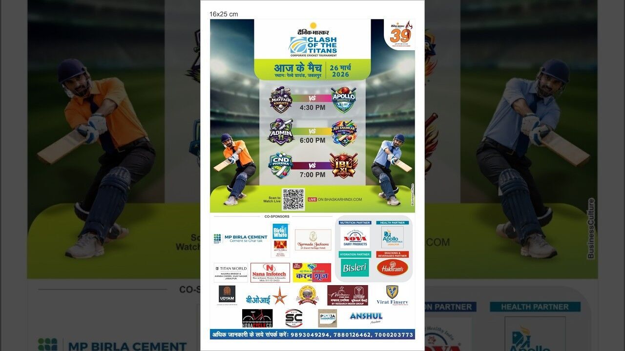डिजिटल डेस्क, जबलपुर। जबलपुर के रेलवे मैदान पर दैनिक भास्कर कॉर्पोरेट कप क्रिकेट टूर्नामेंट का शानदार प्रदर्शन चल रहा है। हर दिन रोमांच अपने चरम पर ही नजर आ रहा है। खिलाड़ी मैदान पर पूरी ऊर्जा के साथ उतर रहे हैं और अपनी टीम को जीत दिलाने के लिए शानदार प्रदर्शन कर रहे हैं। यही वजह है कि हर मुकाबला दर्शकों के लिए खास बनता जा रहा है। गुरुवार, 26 मार्च को टूर्नामेंट का पांचवां दिन भी जबरदस्त मुकाबलों से भरा है। आज के दिन भी प्लेयर्स अपनी कमर कस मैदान पर उतर गए हैं।