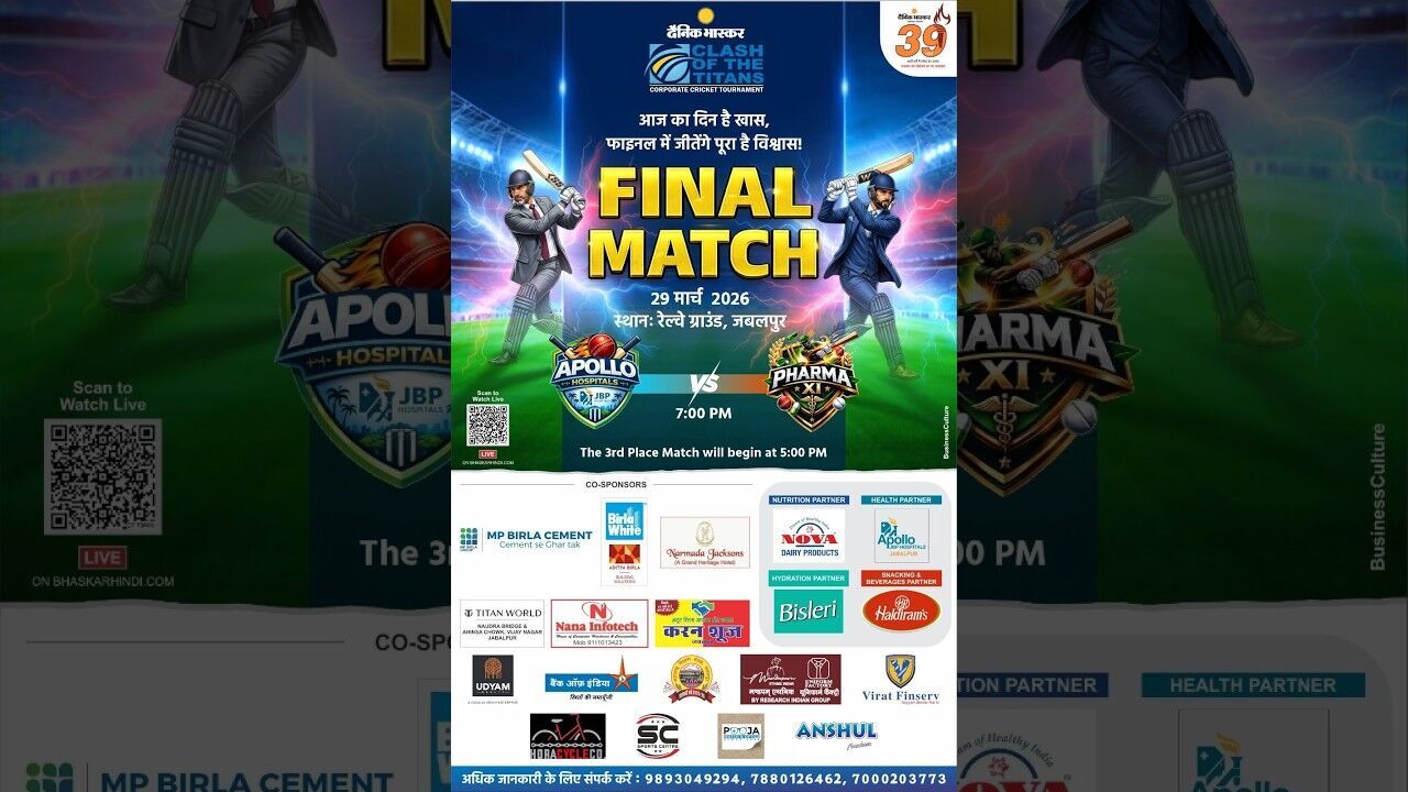 डिजिटल डेस्क, जबलपुर। दैनिक भास्कर कॉर्पोरेट कप क्रिकेट अब अपने आखिरी पड़ाव पर है। शनिवार को खेले गए सेमीफाइनल मुकाबलों में अपोलो हॉस्पिटल्स और फार्मा इलेवन ने शानदार प्रदर्शन किया और फाइनल में जगह बना ली। आज जबलपुर के रेलवे ग्राउंड में शाम 7 बजे दोनों टीमें ट्रॉफी के लिए आमने-सामने हैं। जो लोग मैदान तक नहीं पहुंच पाए हैं, वे भास्कर हिंदी की वेबसाइट पर लाइव मैच देख सकते हैं। यह टूर्नामेंट सिर्फ क्रिकेट तक सीमित नहीं है, बल्कि कॉर्पोरेट जगत के खिलाड़ियों को खेलने का मंच देने और खेल भावना को बढ़ावा देने का भी काम कर रहा है।
